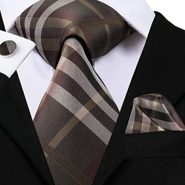 Looking to add sophistication to your ensemble effortlessly? Our Men's Brown Silk Necktie Cufflink Set is your answer. Each purchase includes a luxurious silk necktie, a finely woven pocket square, and a pair of sleek cufflinks, meticulously crafted to enhance your formal attire.